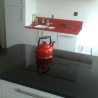 The Eagle’s Nest was made to suit one’s comfort and social life but also to please one’s eyes with designs and ornamentations. In the white kitchen the black Granit floor and a black Granit peninsular worktop deliver a sober style. A scarlet red and white Corian sink, cast in one single piece, completes the black and white character of the kitchen with some occasional red details.